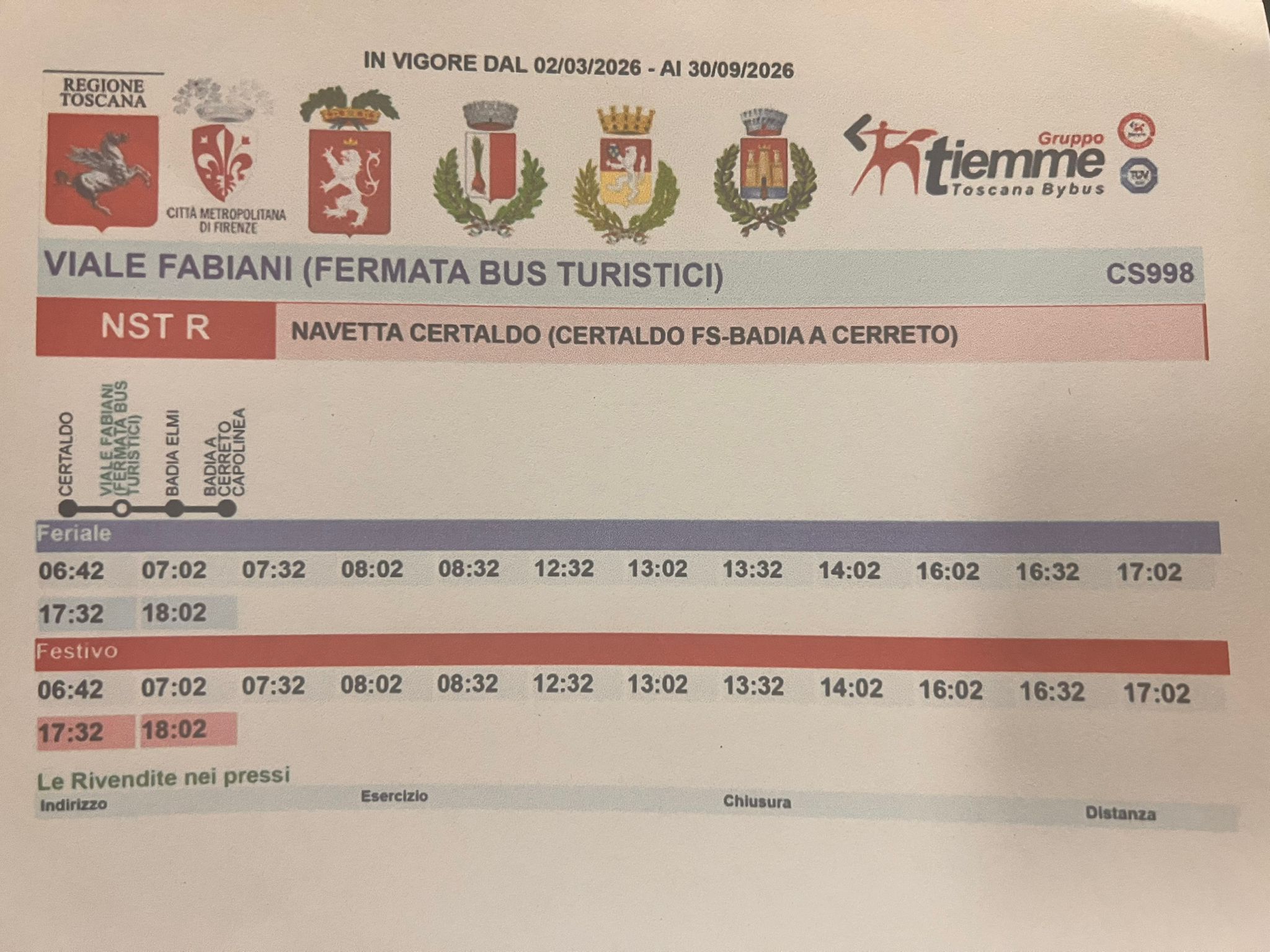 Le fermate utilizzate saranno quelle già esistenti del trasporto pubblico locale, opportunamente segnalate, e gli orari saranno consultabili sui siti istituzionali dei Comuni coinvolti, tra cui Certaldo, San Gimignano e Gambassi Terme oltre che in corrispondenza delle stesse fermate.